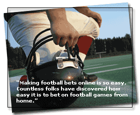 Making football bets online is so easy. There are countless folks just like you who have discovered how easy it is to bet on football games from home. All the tools you need are your trusty computer, a good internet connection and a valid credit card.